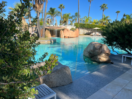 Tiefgarage, Waschplatz, Tennisplätze, Poollandschaft und eigene Meeresbucht. Hier verbringen wir 6 Nächte mit Halbpension und Tischwein.
